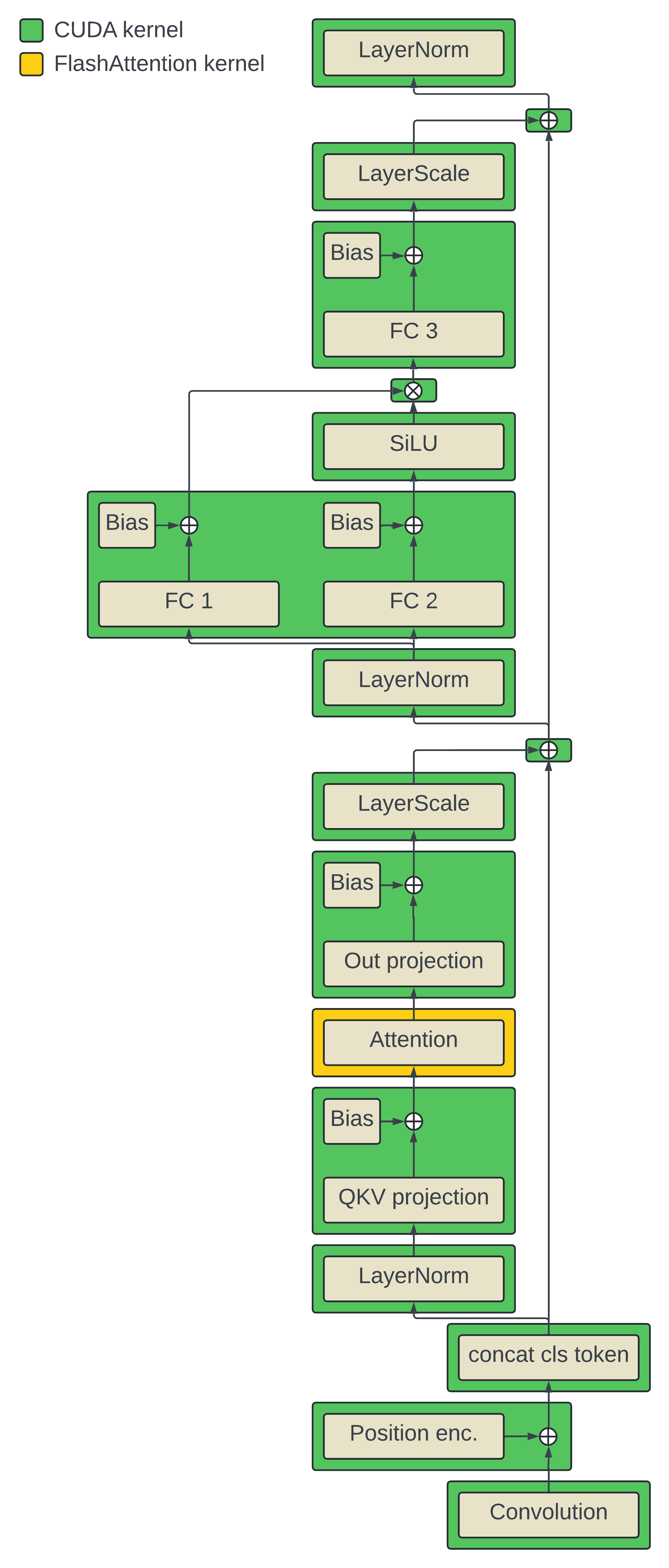 model = model.eval().half().cuda()Let's understand the computation graph of this architecture before looking at optimizations. Below is an image illustrating the flow of operations for this model (imagine though it's a 1 layer ViT instead of 40 layers). Read from bottom to top.